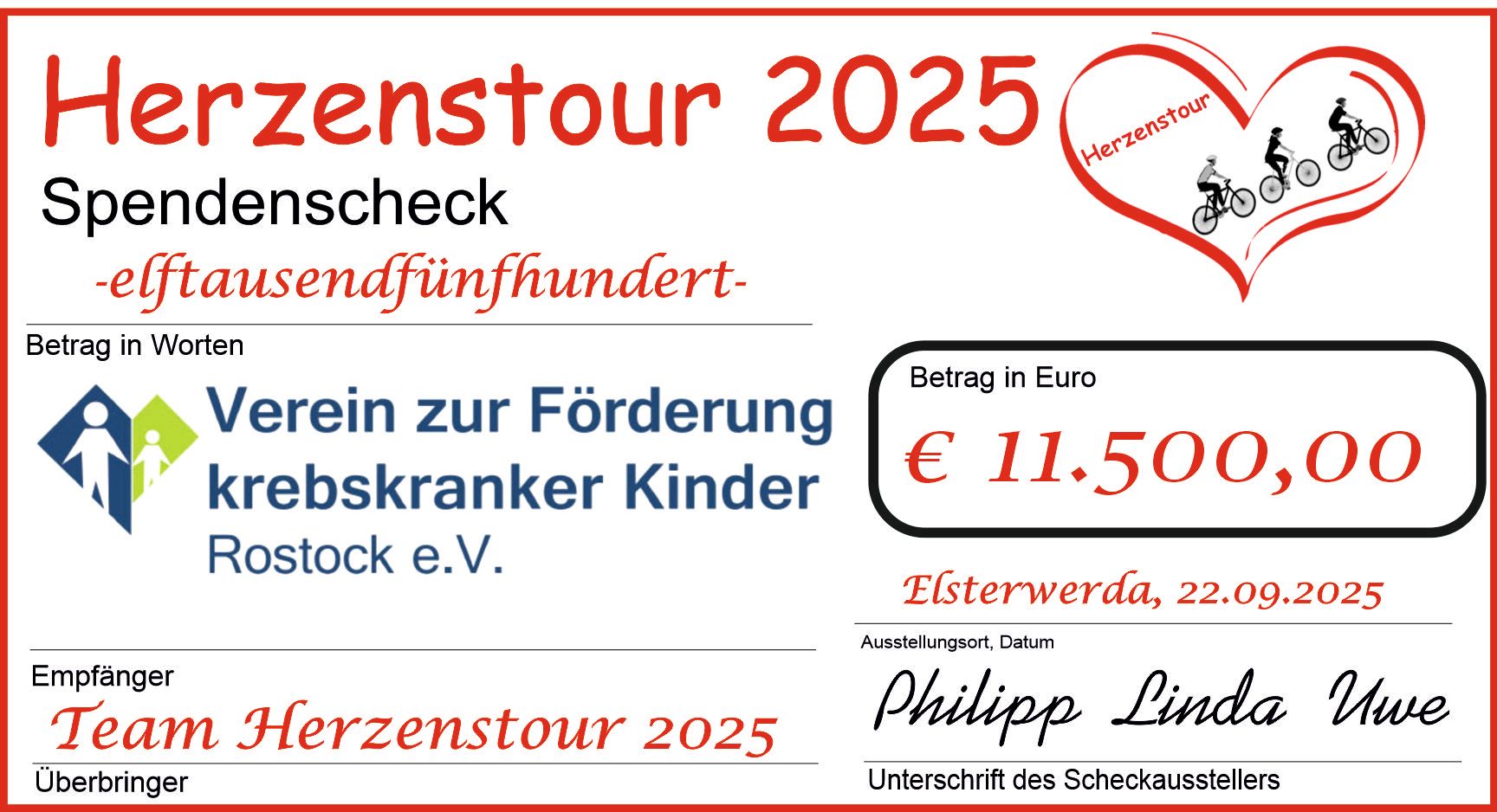 This year, we once again held a Heart Tour. We had the unique opportunity of having a completely new cycle path and new cities at our disposal. The Heart Tour 2025 took us from August 15th to 24th, 2025, from Kiel via Weißenhäuser Strand, Grömitz, Travemünde, Wismar, Warnemünde, Prerow, and Stralsund to Greifswald. The association was able to use the donations, totaling €11,500, to Support for Children with Cancer Rostock eV The non-profit organization was founded in 1992 by affected parents and interested parties to support children with cancer and their families during the difficult period of treatment and afterward. The support is provided on a highly individualized basis.