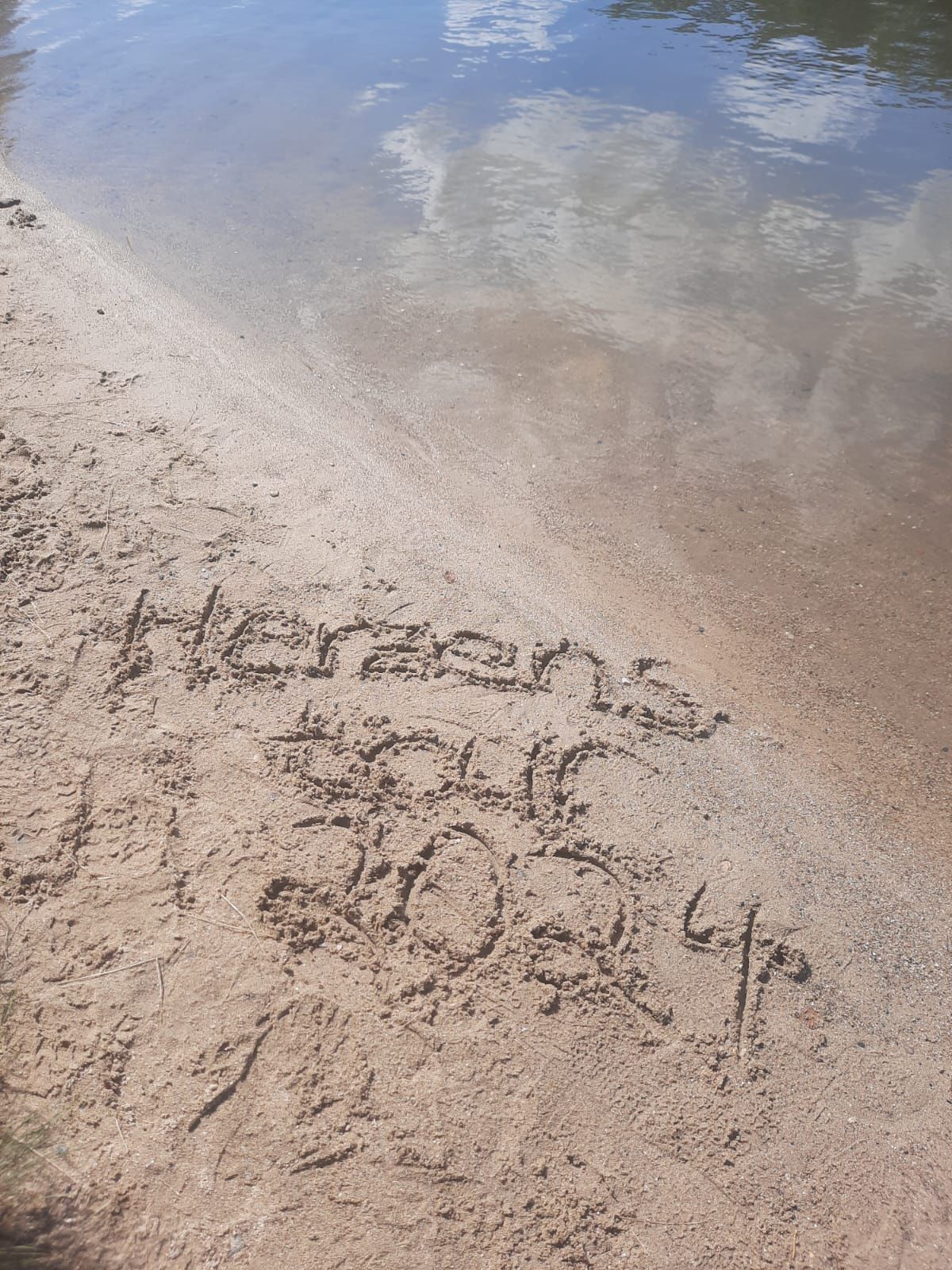The route took us through Wettin past the Wettin Monastery, and a few kilometers further on, we reached the Brachwitz ferry, where we covered more than half of today's route. Upon arriving in Halle, we fortified ourselves with a cool drink, and Philipp took the opportunity to refresh himself in the Saale River. Linda drew our traditional Herzenstour picture in the sand. Afterwards, we went to the market square to reward ourselves for today's stage with a delicious ice cream sundae. Now we're winding down the evening and preparing ourselves mentally and morally for our final Herzenstour stage, which is tomorrow. We can hardly believe the week has gone by so quickly again.