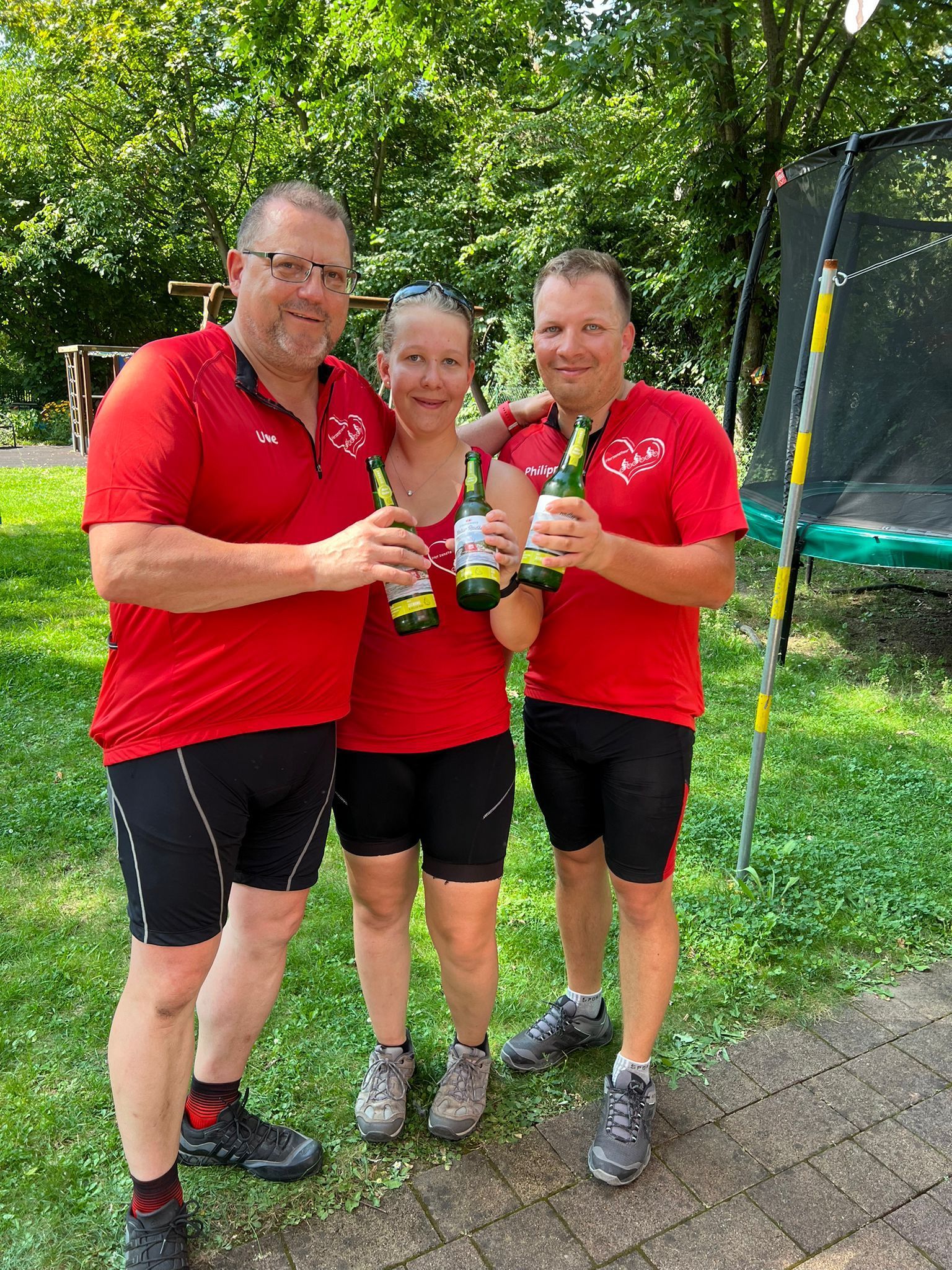 In Dresden today, we had the first flat tire of our Heart Tour story. Linda's bike probably took a hit on a cobblestone or something similar, which caused the air to go out. Luckily, Uwe had a puncture spray that you put in the tires. This at least allowed us to ride to the Sonnenstrahl eV (Sunbeam eV) on Goetheallee. There, Uwe and Philipp changed the front tire tube.