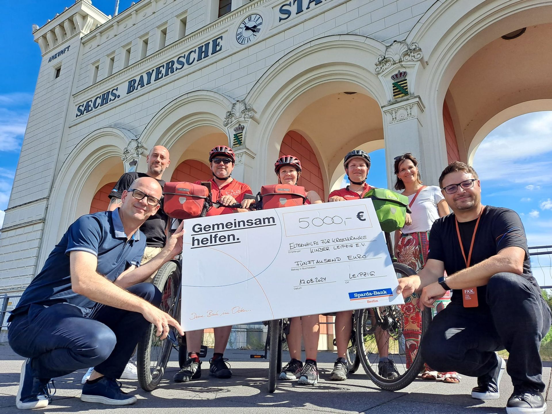 At 1:15 p.m., we arrived on Philip-Rosenthal-Straße in Leipzig, where we were greeted by Kristina Paarmann and Sören Uhle from the association "Parents' Support for Children with Cancer in Leipzig" and employees of Spardabank Berlin eG. Spardabank Berlin eG had already supported us in the 2023 Herzenstour and is by our side again this year. We are delighted that the bank is once again supporting our partner organization with 5,000 euros. Linda and Uwe also gave an interview to Rocky Sauer, social media manager of Spardabank Berlin eG.