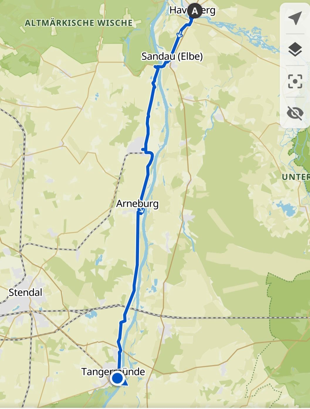 El día comenzó con un desayuno en la panadería rural Stendal de Havelberg, desde donde se disfrutaba de una hermosa vista de la iglesia. Pudimos planificar nuestra visita con tranquilidad, ya que el trayecto a Tangermünde es corto. El primer momento culminante fue cruzar el Elba en el ferry Sandau. Poco después, llegamos a la fábrica de celulosa Mercer. Antes de planificar la visita, Uwe había visto que había un centro técnico de bomberos cerca. Una vez allí, charlamos con algunos empleados de la Zona Franca. La vieja bomba manual de la foto se utilizó para la extinción de incendios en Berlín en la década de 1940. También supimos que se planeaba construir una central nuclear en el lugar donde hoy se encuentra la fábrica de celulosa. Sin embargo, estos planes se abandonaron tras el desastre de Chernóbil y la caída del Muro de Berlín. Los restos del reactor y las bombas de refrigeración previstas originalmente aún se pueden ver. Tras unos kilómetros, llegamos a la ciudad de Arneburg, con más de mil años de antigüedad, y entablamos conversación con la pastora Janette Obera. Ya la habíamos conocido hacía tres años, cuando Philipp, como era de esperar, le preguntó si podía tocar el órgano. Lamentablemente, hoy no se podía tocar, ya que la iglesia estaba en obras. Unos minutos después, recibimos una donación de su madre, con quien también hablamos brevemente de nuestro proyecto.Después nos dirigimos al mirador de Arneburg y disfrutamos de la vista del valle del Elba.