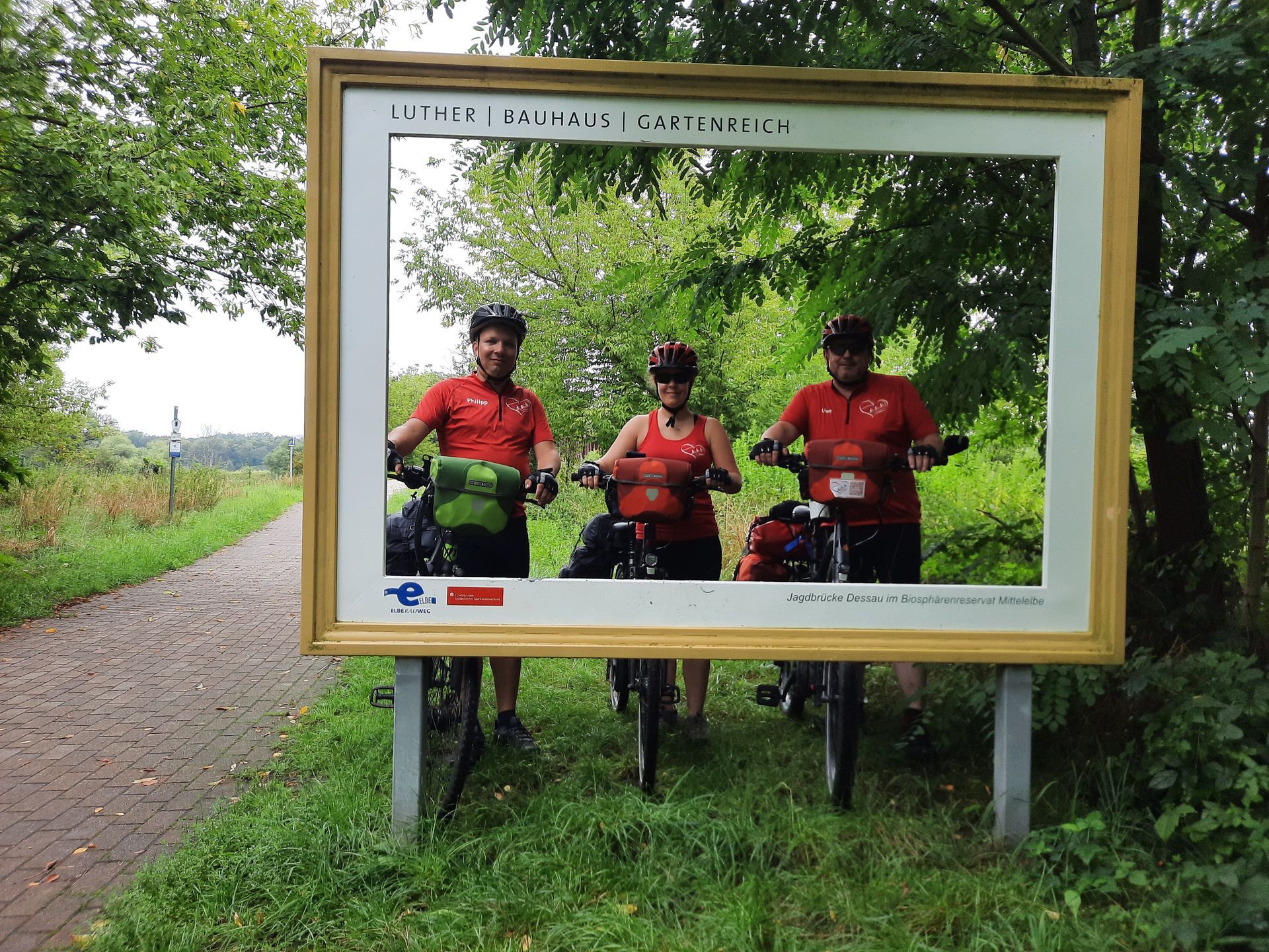 Hoy teníamos una etapa más corta. Tras un delicioso desayuno en la panadería Lantzsch, pedaleamos por un parque idílico. Al principio hacía bastante frío y había niebla, pero no tardó en salir el sol. Gracias a los numerosos árboles, pudimos pedalear a la sombra la mayor parte del camino. Poco después de Dessau, una mujer en bicicleta se nos acercó y nos preguntó qué era el Herzenstour (Vuelta al Corazón). Se lo explicamos y le entregamos un folleto.