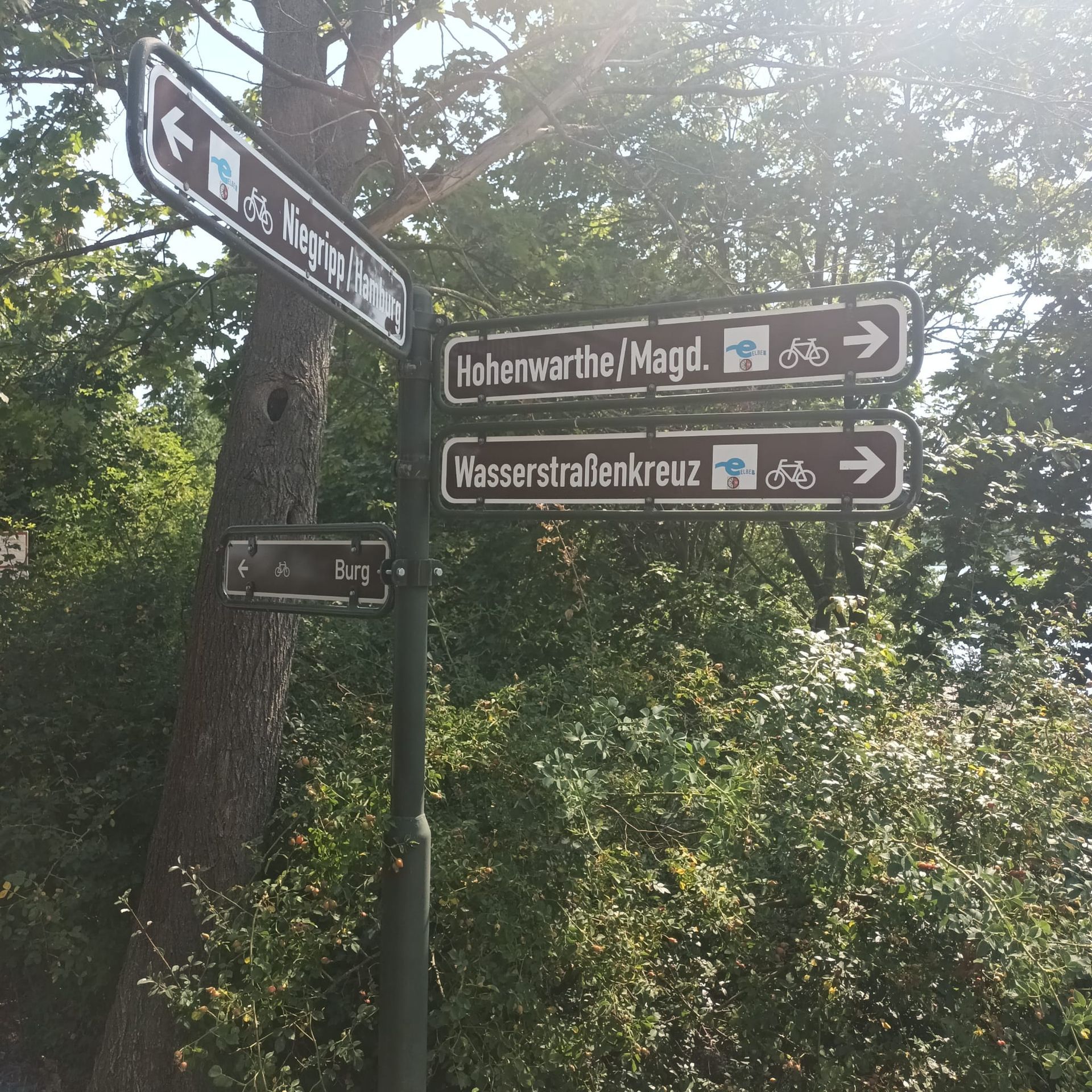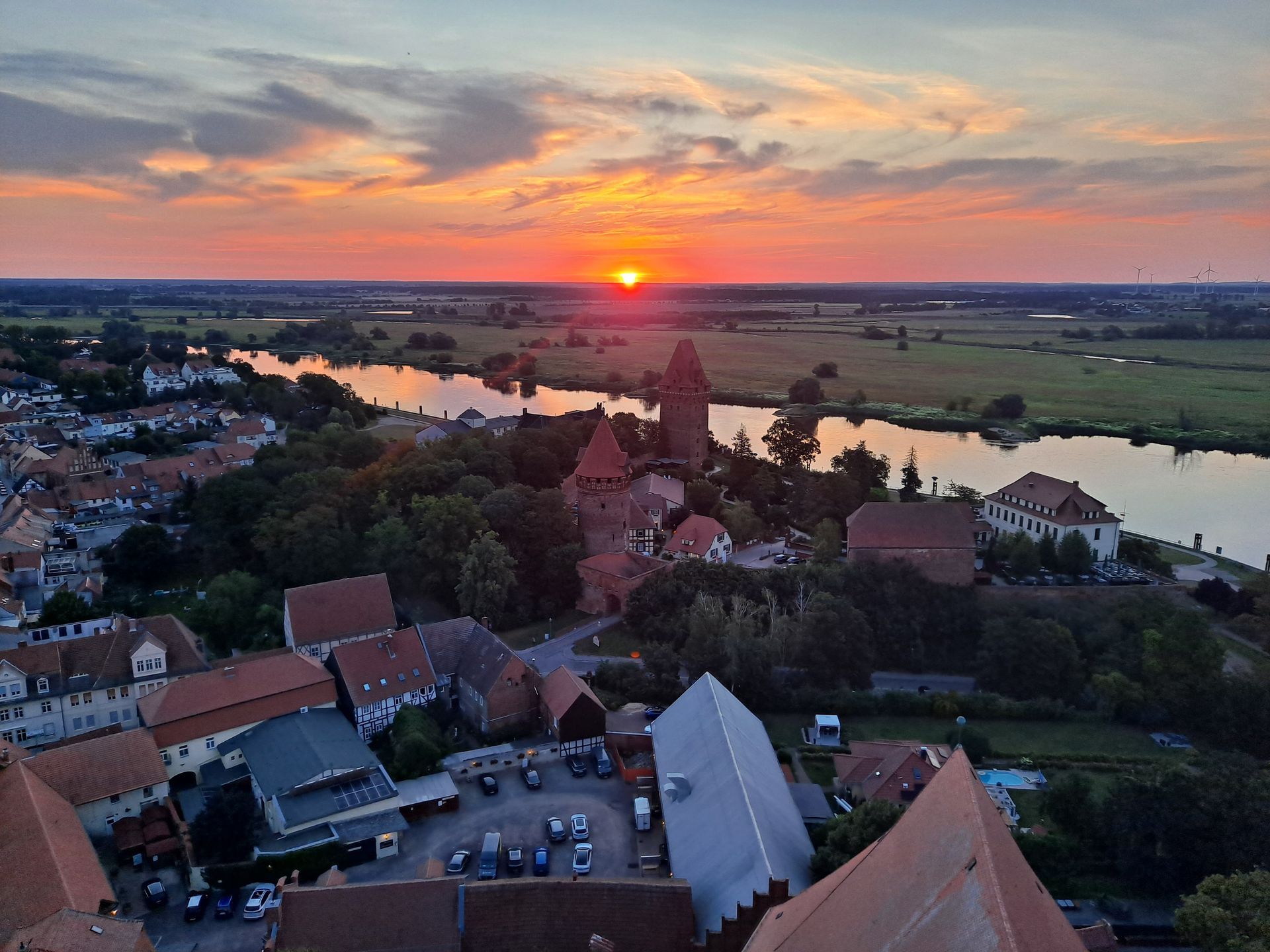 Hoy empezamos de forma muy diferente. Ayer por la tarde ya estábamos en la torre de la iglesia de San Esteban en Tangermünde, y ayer por la noche se nos ocurrió disfrutar del amanecer desde allí. Lo pusimos en práctica esta mañana, y qué decir: a pesar de lo agotadora que fue la subida a estas horas de la noche, sin duda valió la pena. Como nos levantamos temprano, desayunamos temprano y pudimos partir hacia Magdeburgo temprano. Al fin y al cabo, nos esperaba un día muy caluroso, así que nuestra prioridad era llegar a Magdeburgo lo antes posible.