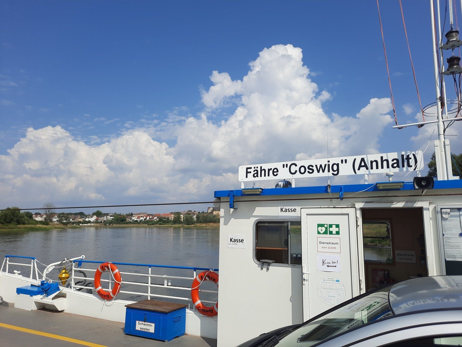 En Dommitzsch, cruzamos el Elba en ferry. Las temperaturas seguían siendo agradables por la mañana, pero subieron rápidamente mientras conducíamos hacia casa de Katharina en Jessen. Allí, nos reponemos con una deliciosa solyanka, bebidas heladas y nos refrescamos en la piscina. ¡Qué bien nos sentamos!