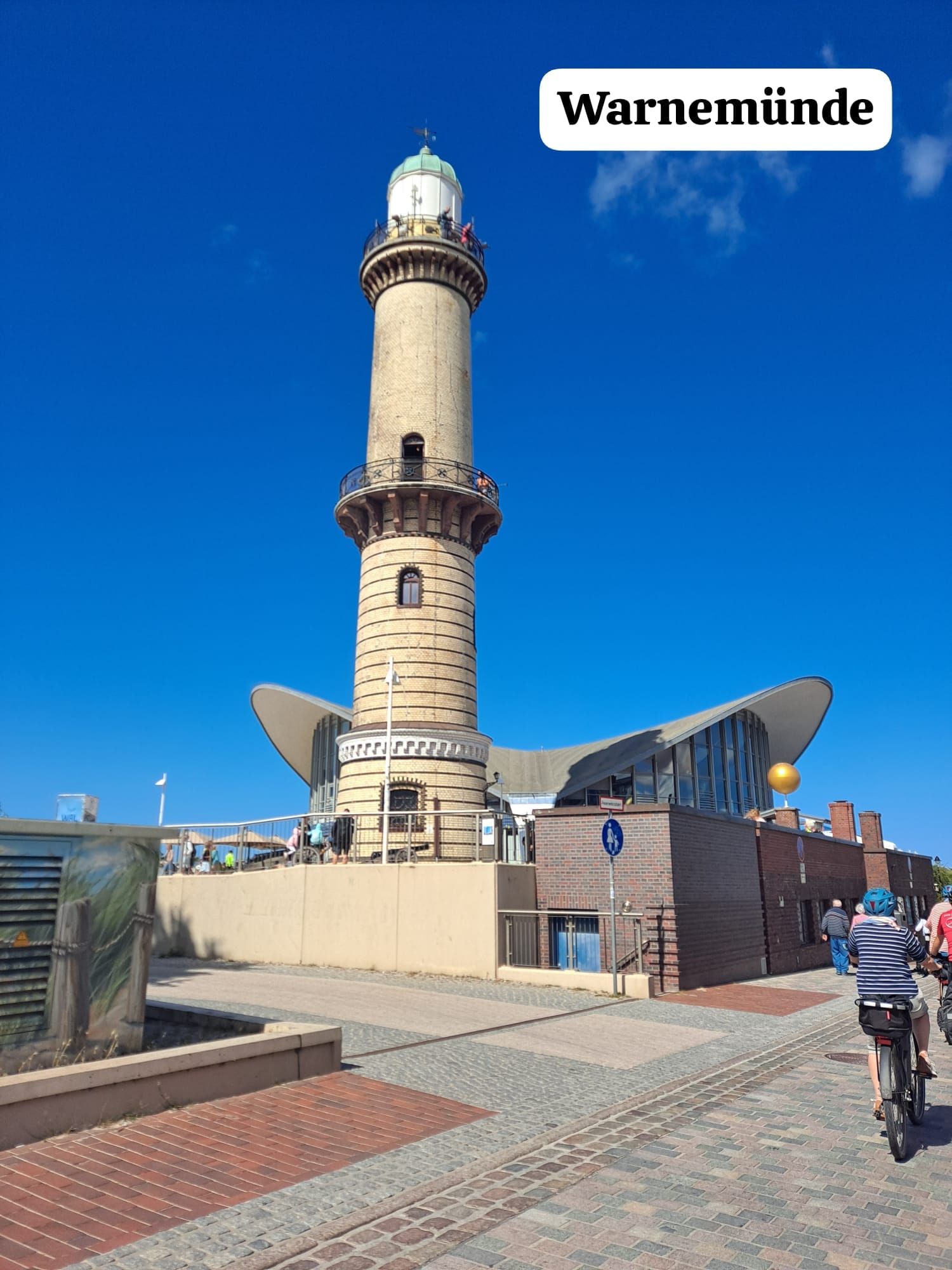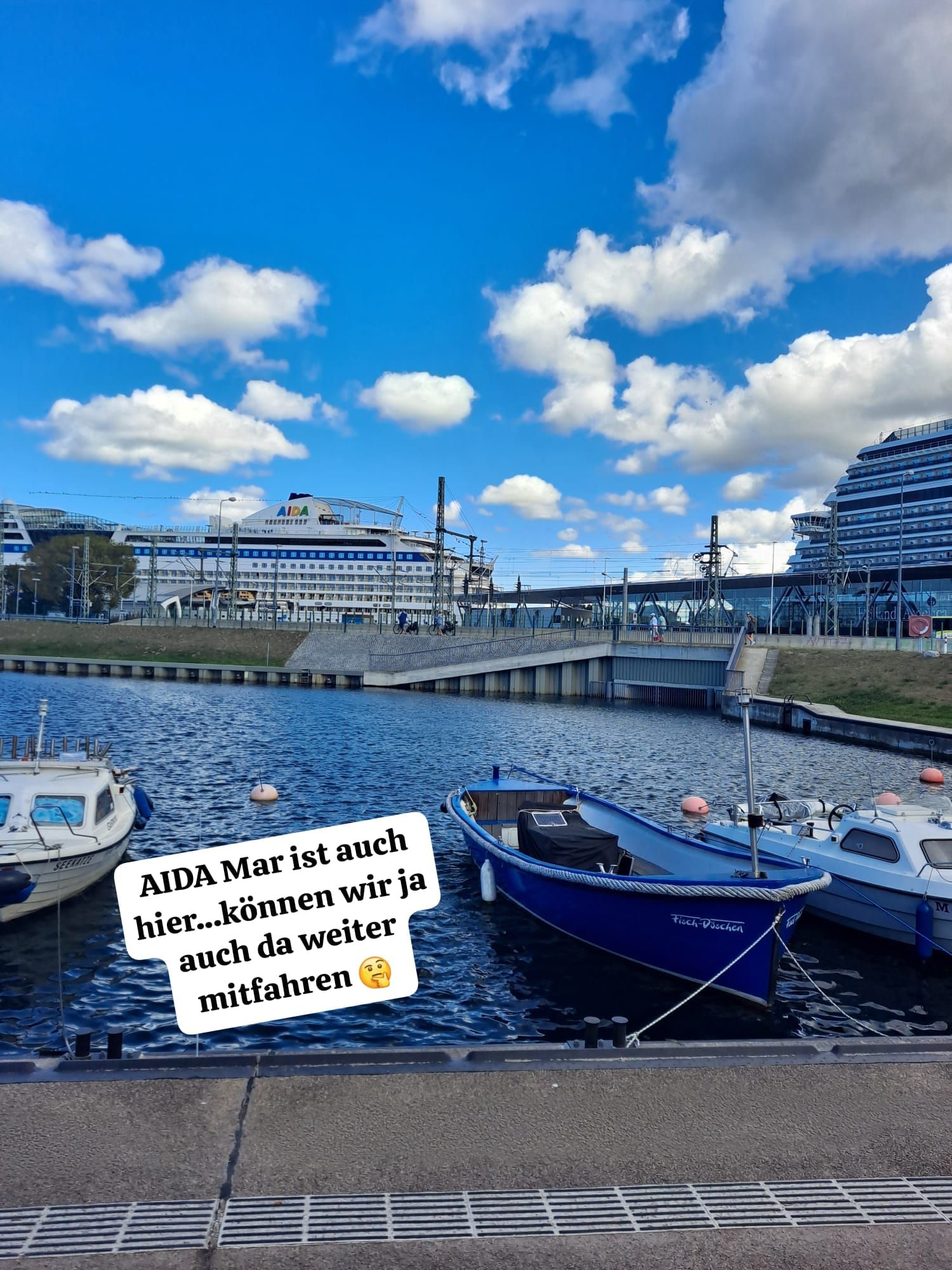 Hoy desayunamos más temprano de lo habitual porque teníamos la agenda apretada. Unos amigos del pueblo de Uwe nos ofrecieron quedar con ellos en su camping para tomar algo fresco. También visitamos el club en Rostock. Así que desayunamos a las 6:30 para poder llegar a tiempo a nuestras bicicletas. Salimos a las 7:40 e hicimos otra parada rápida en el puerto para admirar el nuevo barco de Disney, que incluso tiene una montaña rusa en la cubierta superior. En Stove, pasamos en bicicleta junto al molino de viento holandés. Una impresionante obra de arte. Poco después, tuvimos que tomar un descanso por la lluvia, que por suerte no duró mucho. En Kühlungsborn, un balneario báltico, disfrutamos de unas preciosas vistas de las embravecidas olas del mar Báltico. El viento nos refrescó hoy, pero, por desgracia, soplaba sobre todo de frente. Poco después de Heiligendamm, nos reunimos con los amigos de Uwe y nos tomamos un descanso para recuperar fuerzas con una bebida fría y algo para picar. El carril bici a Warnemünde discurría principalmente por el bosque, donde estábamos algo más protegidos del viento y el sol. Un punto culminante fue el llamado Bosque Fantasma. Pero no vimos ningún fantasma. Hoy en Warnemünde pudimos admirar tres cruceros. Entre ellos estaba el AIDAmar, en el que Philipp ya había estado.