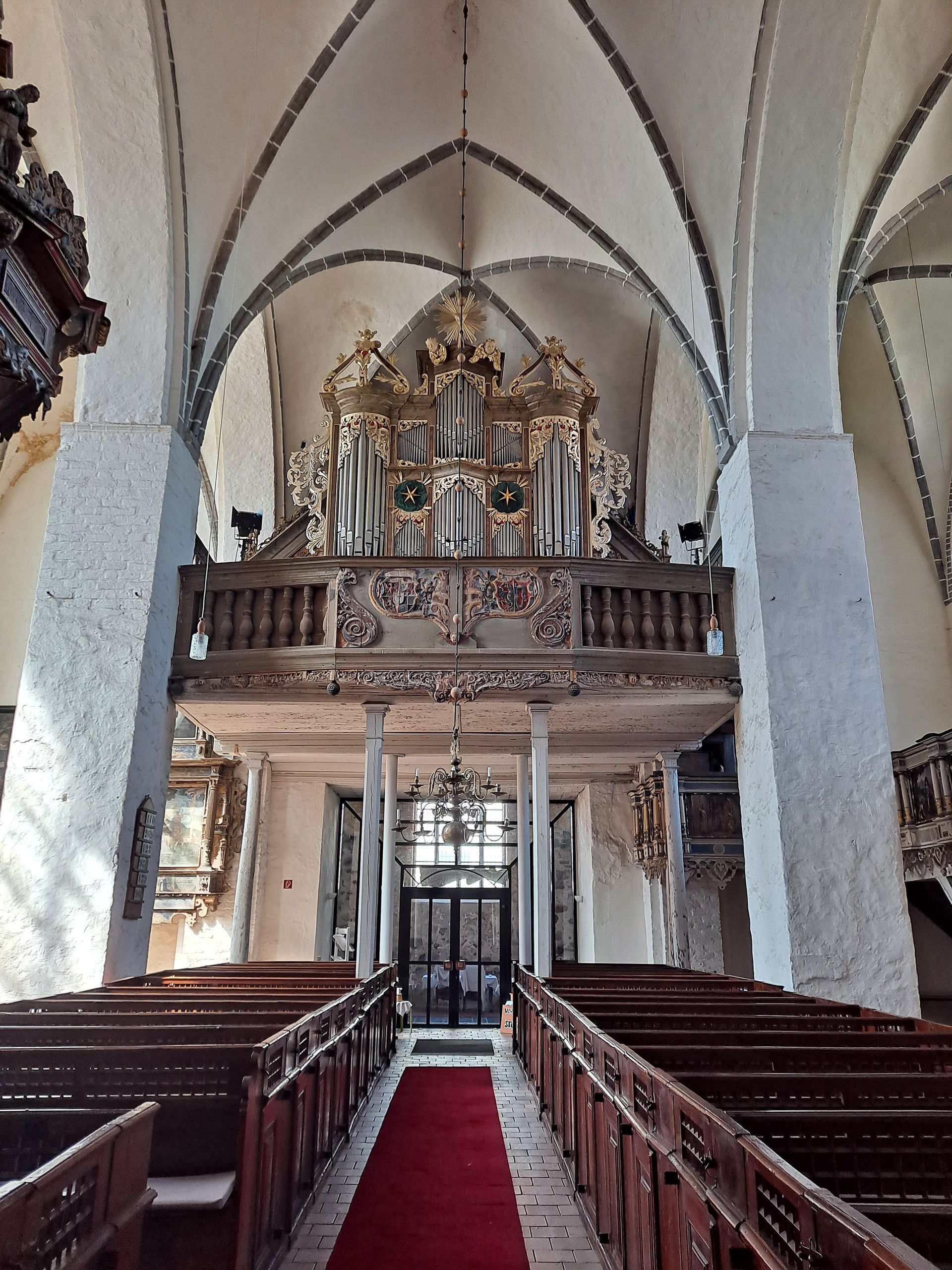 Nach einem ausgiebigen Frühstück in der Therme sattelten wir unsere Räder auf und fuhren Richtung Havelberg los. Da das Wetter sehr gut mitspielte, planten wir eine Zwischenetappe zum See in Wusterhausen ein. Auf diesem Teilstück waren schon viele Kirchen am Weg, aber viele waren leider abgeschlossen. In Wusterhausen angekommen, erreichten wir die St. Peter- und Paulkirche und diese war geöffnet. Ganz zur Freude von Philipp, der sich ja für die Orgeln interessiert, die sich darin befinden. Der Zugang zur Orgelempore war leider versperrt. Allerdings gab es noch eine kleinere Orgel in der Nebenkirche und Philipp kennt als ehrenamtlichen Organist die üblichen Schlüsselverstecke. Und was sollen wir sagen? Er ist fündig geworden und hatte so die Möglichkeit seine 118. Orgel zu spielen. Wenig später fuhren wir dann zum besagten See, wo sich das Strandbad befindet, indem wir uns eine Abkühlung gegönnt haben. Das tat bei den warmen Temperaturen sehr gut. Philipp wagte einen Sprung vom 3-Meter-Brett und dann stärkten wir uns mit einer Currywurst mit Pommes bevor wir den restlichen Weg nach Havelberg geradelt sind. Aufgrund von zwei Umleitungen sind aus geplanten 62,5 Kilometern heute 70,1 Kilometer geworden. Als wir angekommen sind, waren unsere Trinkflaschen und auch die Reservevorräte bis auf den letzten Tropfen aufgebraucht, da es heute sehr heiß war.