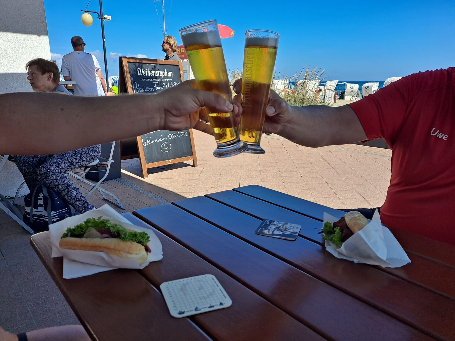 In Dahme gab es dann das traditionelle Fischbrötchen für Uwe und Philipp. Linda entschied sich entgegen für ein Hähnchenbaguette. Das kühle Bier war eine willkommene Erfrischung für uns. Eine weitere Sehenswürdigkeit waren der alte und neue Leuchtturm in Dahmeshöved. Nach ca. 60 Kilometern haben wir unser heutiges Ziel Grömitz erreicht.