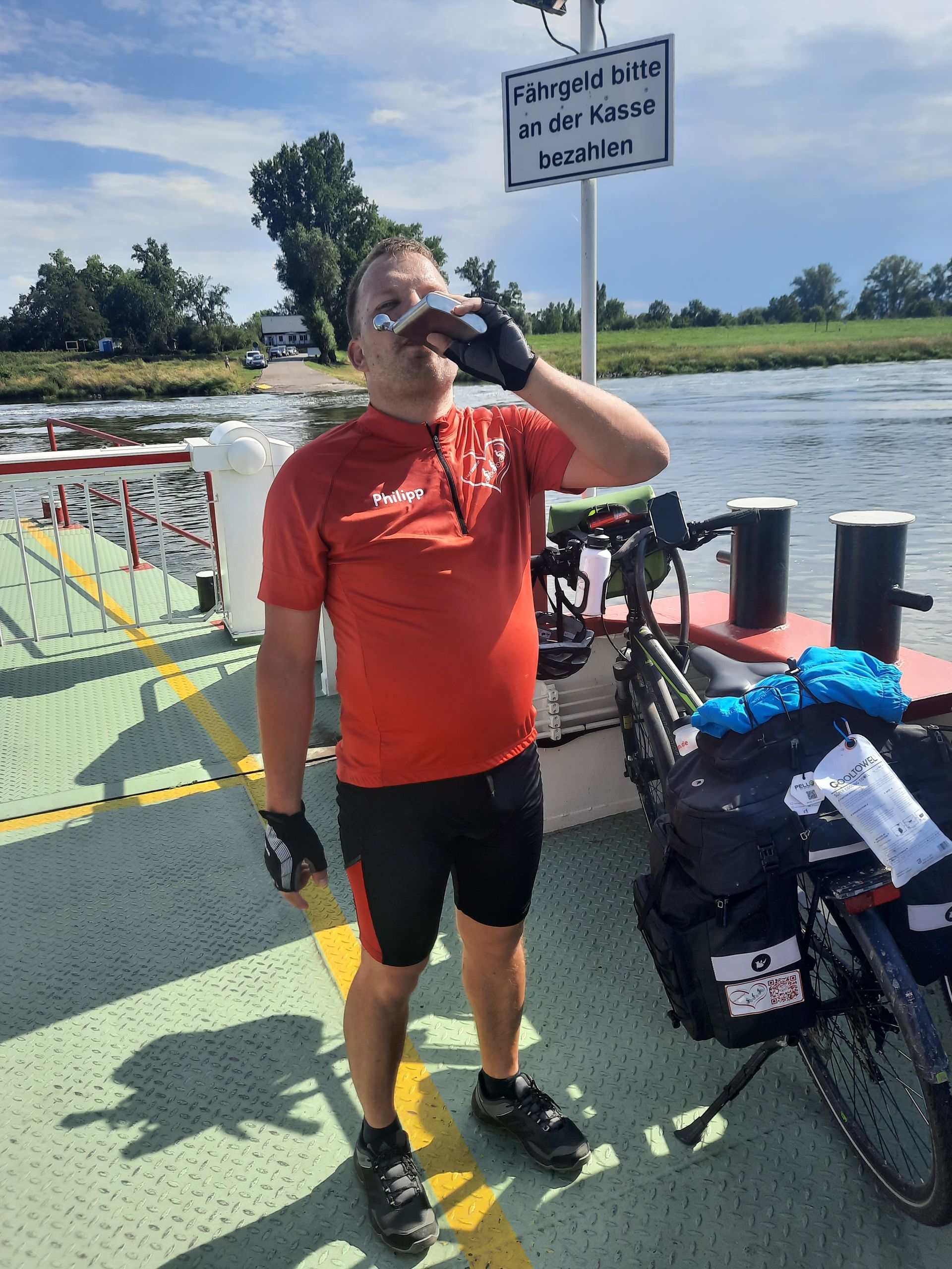 Sur le ferry à Barby, nous avons d'abord bu une petite gorgée de liqueur Herzenstour. Sur l'autre rive de l'Elbe, nous avons cherché le banc oscillant d'Heinrich. Peu avant Dessau, nous avons fait une autre petite pause et Philipp s'est essayé à des exercices d'étirements acrobatiques.