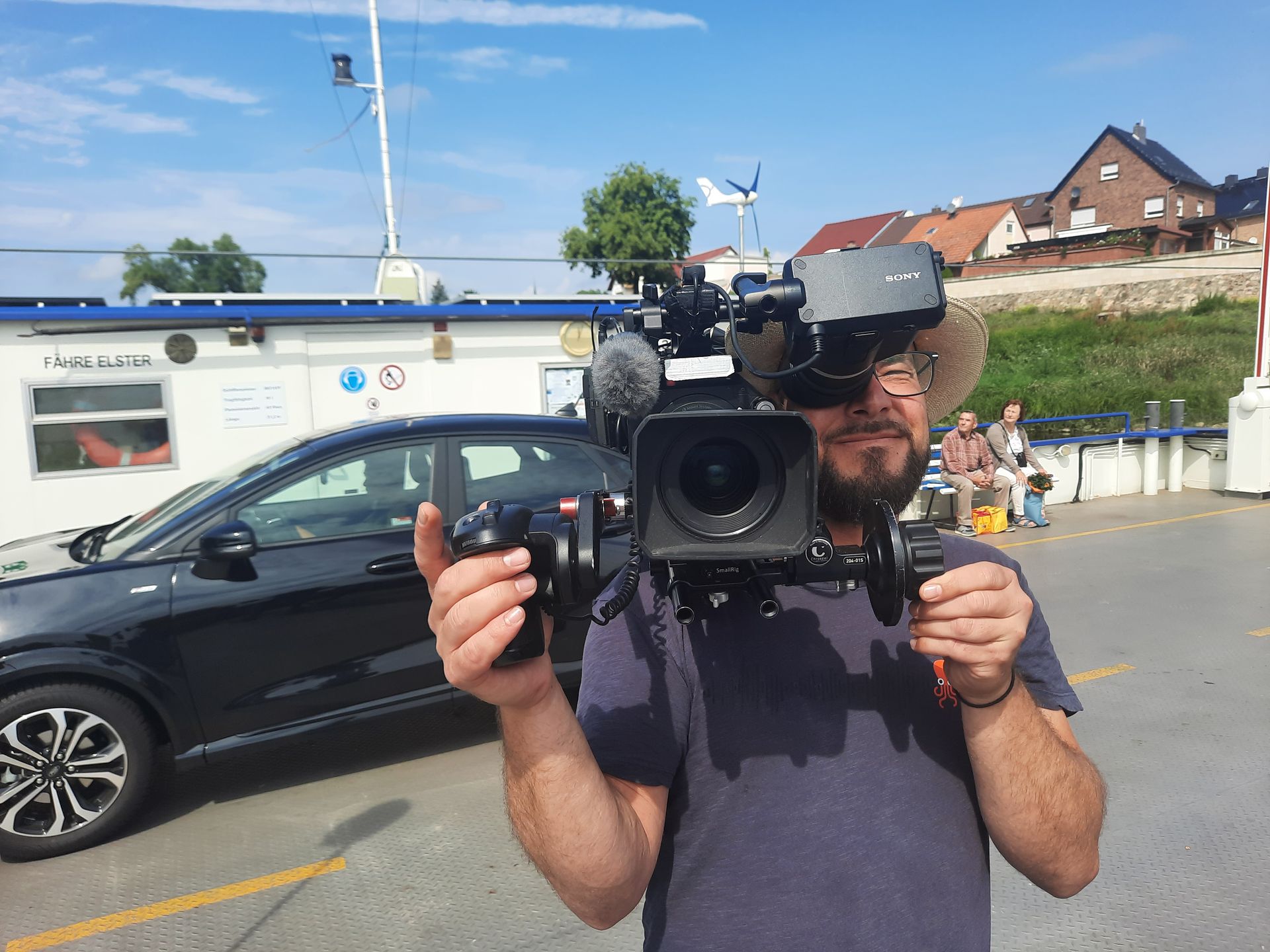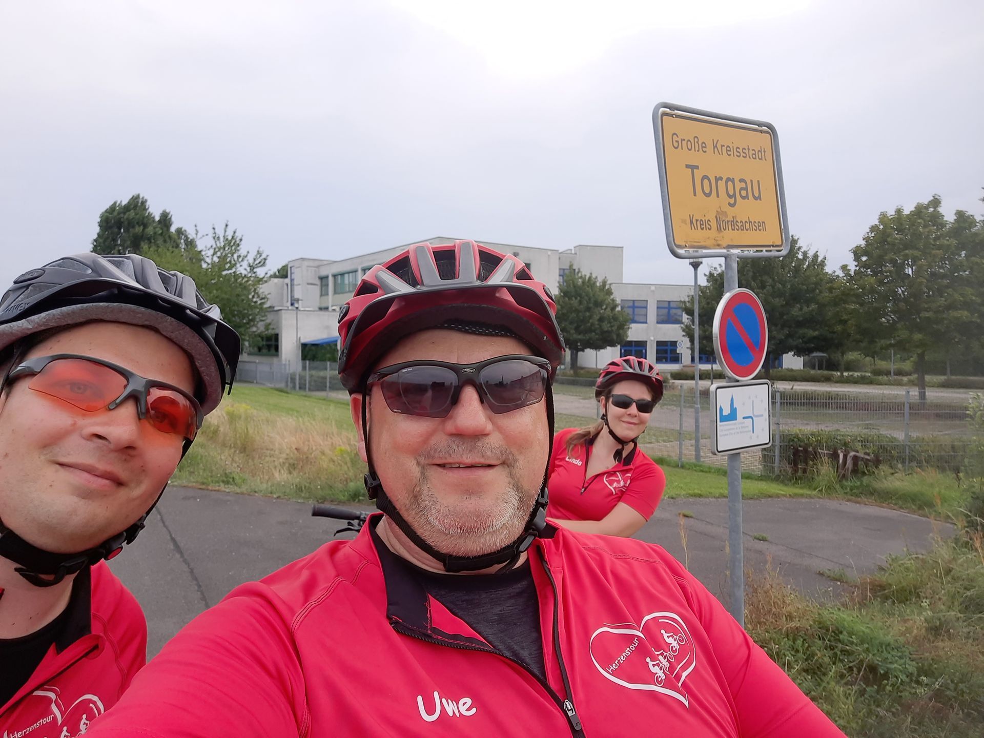 Plus tard, nous avons filmé à différents endroits. Ils nous ont filmés à vélo, les pauses et la vue sur la piste cyclable. (Pour cela, une caméra GoPro était fixée au guidon, aux sacoches ou entre les pédales.) Micha (caméra), Christian (son) et Mandy (directrice de production) nous ont bien accompagnés tout au long de la journée. La collaboration a été très harmonieuse. L'équipe nous a même remerciés pour notre patience. Après une quarantaine de kilomètres, nous avons fait une pause à Dommitzsch (district de Greudnitz) au restaurant « Zur Schah Mühle ». La restauratrice Steffi Tunger a eu la gentillesse de nous laisser filmer et a tellement apprécié notre projet qu'elle nous a même fait un petit don. Nous la remercions sincèrement ! N'hésitez pas à passer la voir. Au restaurant, nous avons dit au revoir à l'équipe de télévision : toutes les images et le son avaient été récupérés, et cette partie était terminée pour nous. L'équipe nous a également fait un petit don.