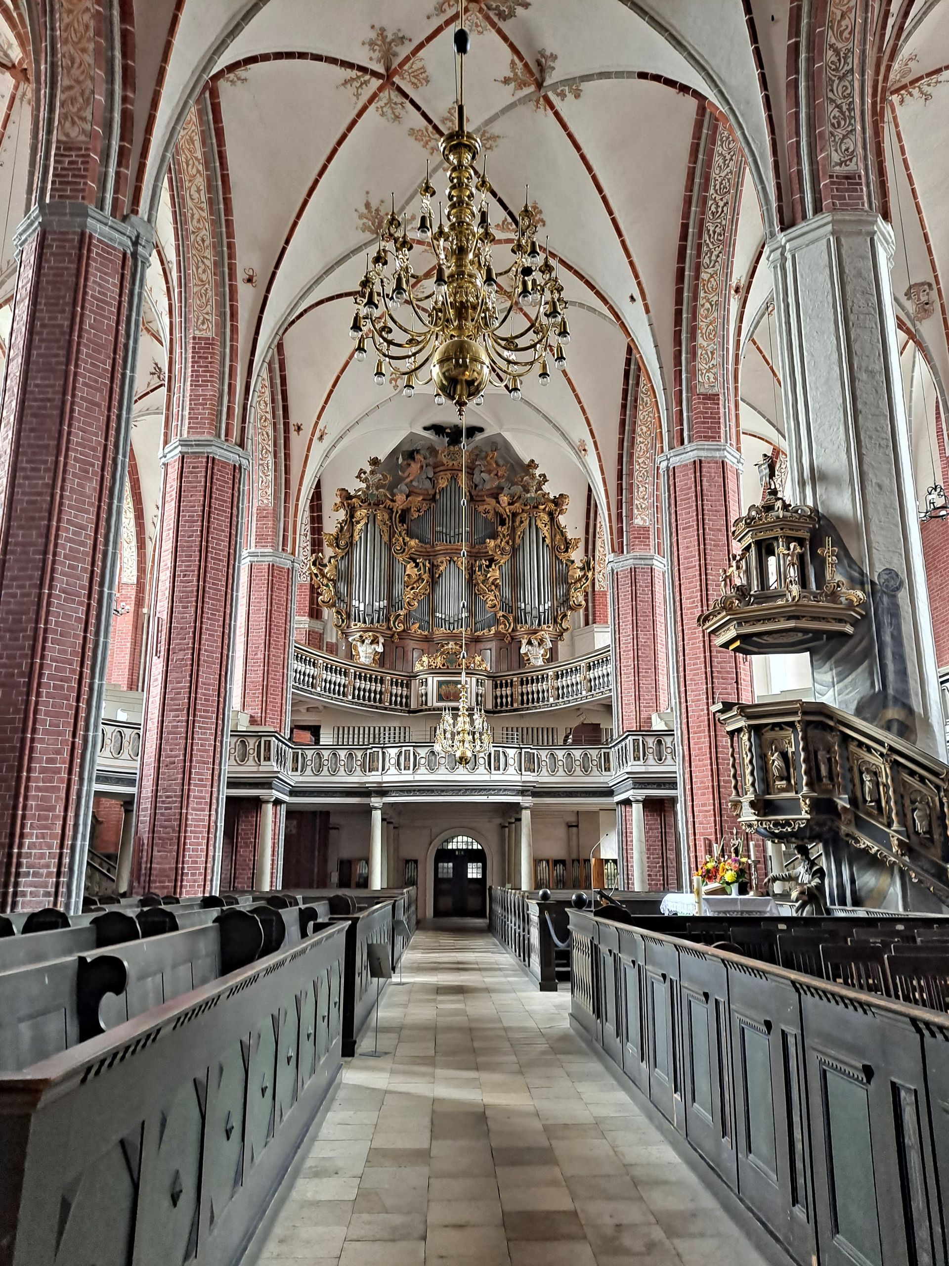 Er stond ons vandaag iets heel bijzonders te wachten in Brandenburg an der Havel. Philipp geeft echter toe dat hij er waarschijnlijk het meest enthousiast over was. Vandaag mochten we het grootste orgel van de deelstaat Brandenburg bespelen. Het staat in de Katharinenkerk. Het schoolorgel heeft vijf manualen, 96 registers en 6364 pijpen. Strikt genomen zijn het vier afzonderlijke orgels die vanaf één speeltafel worden aangestuurd. Wat echter bijzonder indrukwekkend is, is dat het hoofdorgel en het koororgel afzonderlijk bespeeld kunnen worden. Nogmaals dank aan Andreas Patzelt, die de tijd nam om ons dit orgel uit te leggen. Linda speelde "Trust the New Paths" (ook bekend als "Praise God with Confidence") op het orgel. U kunt het zelf bekijken. hier Iedereen die interesse heeft in het instrument kan een kijkje nemen op de Orgelwebsite gooien.
