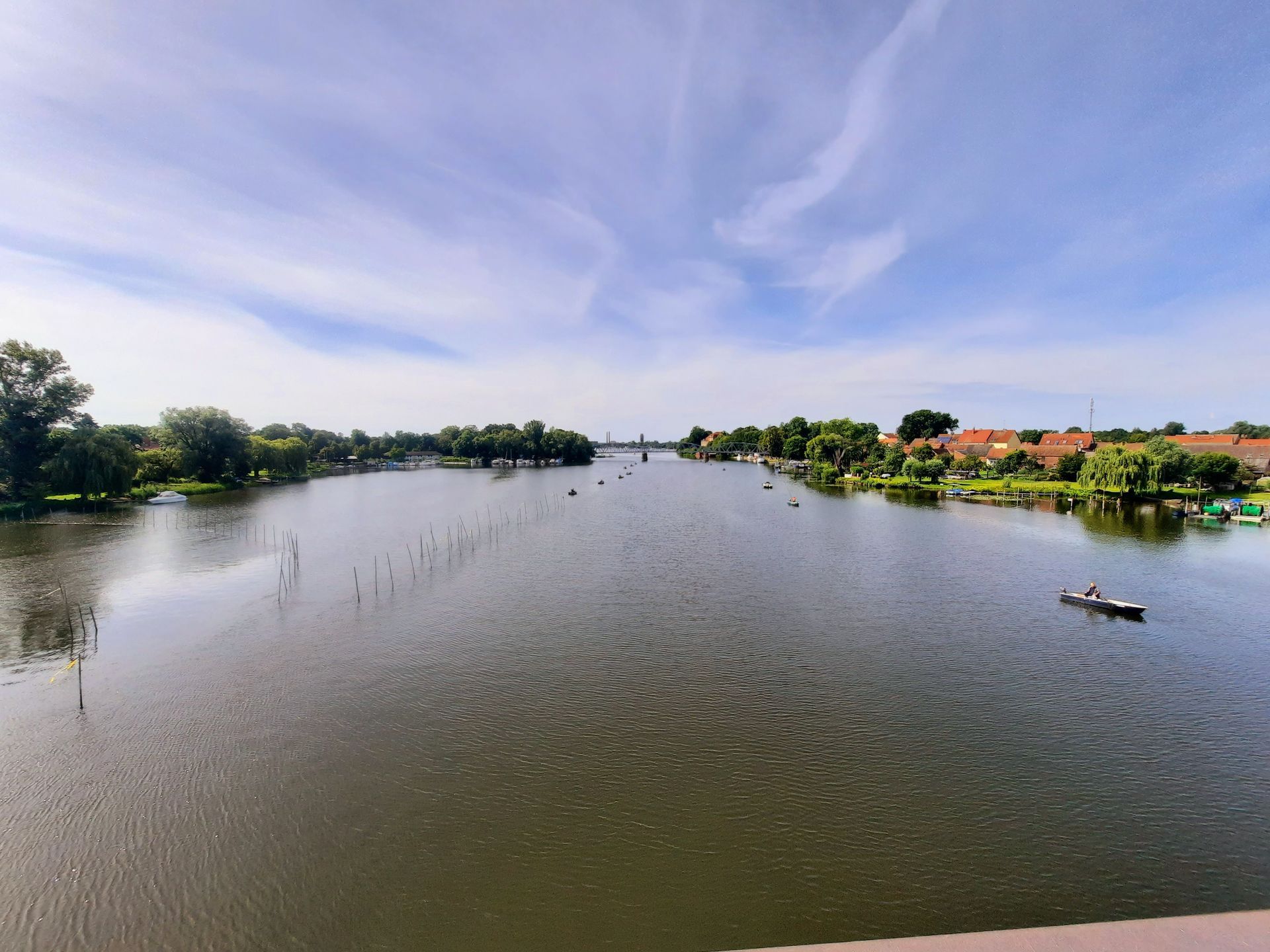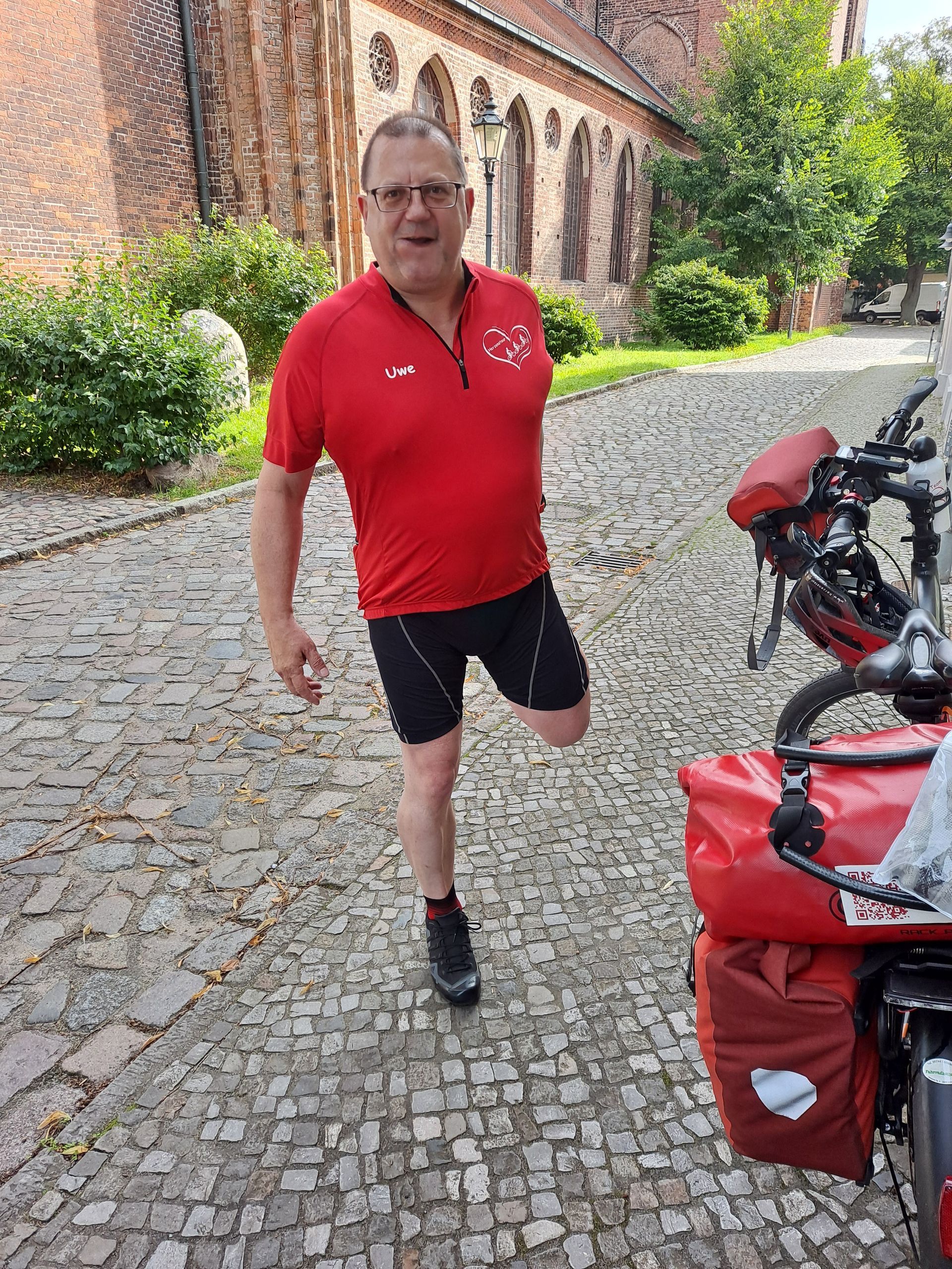 Na een heerlijk ontbijt was het tijd om weer op te zadelen. Voordat we vertrokken, deed Uwe nog even een korte stretch om de kans op kramp te minimaliseren. Ziet er sportief uit, toch? :-) We reden door de oude binnenstad van Brandenburg en het duurde niet lang voordat we een prachtig uitzicht op de Havel hadden. Om ervoor te zorgen dat de schepen kunnen blijven passeren, staan de vissersboten links en rechts in rijen opgesteld.