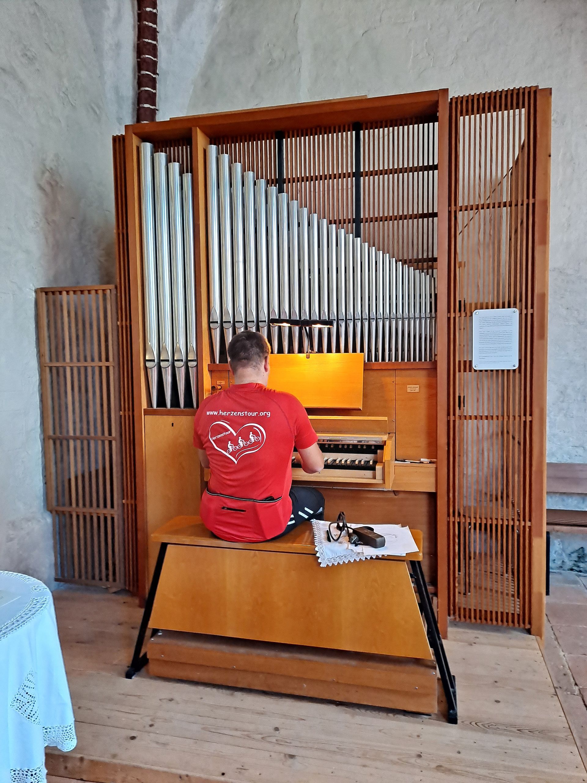 Na een stevig ontbijt in de thermen zadelden we onze fietsen op en vertrokken richting Havelberg. Omdat het weer erg goed was, planden we een stop bij het meer in Wusterhausen. Er waren al veel kerken langs de route, maar helaas waren er veel gesloten. Aangekomen in Wusterhausen bereikten we de St. Peter und Paulskirche, en die was open. Tot grote vreugde van Philipp, die geïnteresseerd is in de orgels binnenin. Helaas was de toegang tot het orgelzolder geblokkeerd. Er stond echter een kleiner orgel in de naburige kerk, en als vrijwillig organist kent Philipp de gebruikelijke sleutelverstopplekken. En wat kunnen we zeggen? Hij vond wat hij zocht en kreeg zo de kans om zijn 118e orgel te bespelen. Even later reden we naar het eerder genoemde meer, waar het badstrand zich bevindt, waar we onszelf trakteerden op wat verkoeling. Dat voelde zeer welkom bij de warme temperaturen. Philipp waagde zich aan een sprong van de drie meter hoge duikplank, waarna we ons versterkten met een curryworst en friet voordat we de rest van de weg naar Havelberg fietsten. Door twee omwegen werd de geplande 62,5 kilometer vandaag 70,1 kilometer. Tegen de tijd dat we aankwamen, waren onze waterflessen en zelfs onze reservevoorraad helemaal leeg, want het was vandaag erg warm.