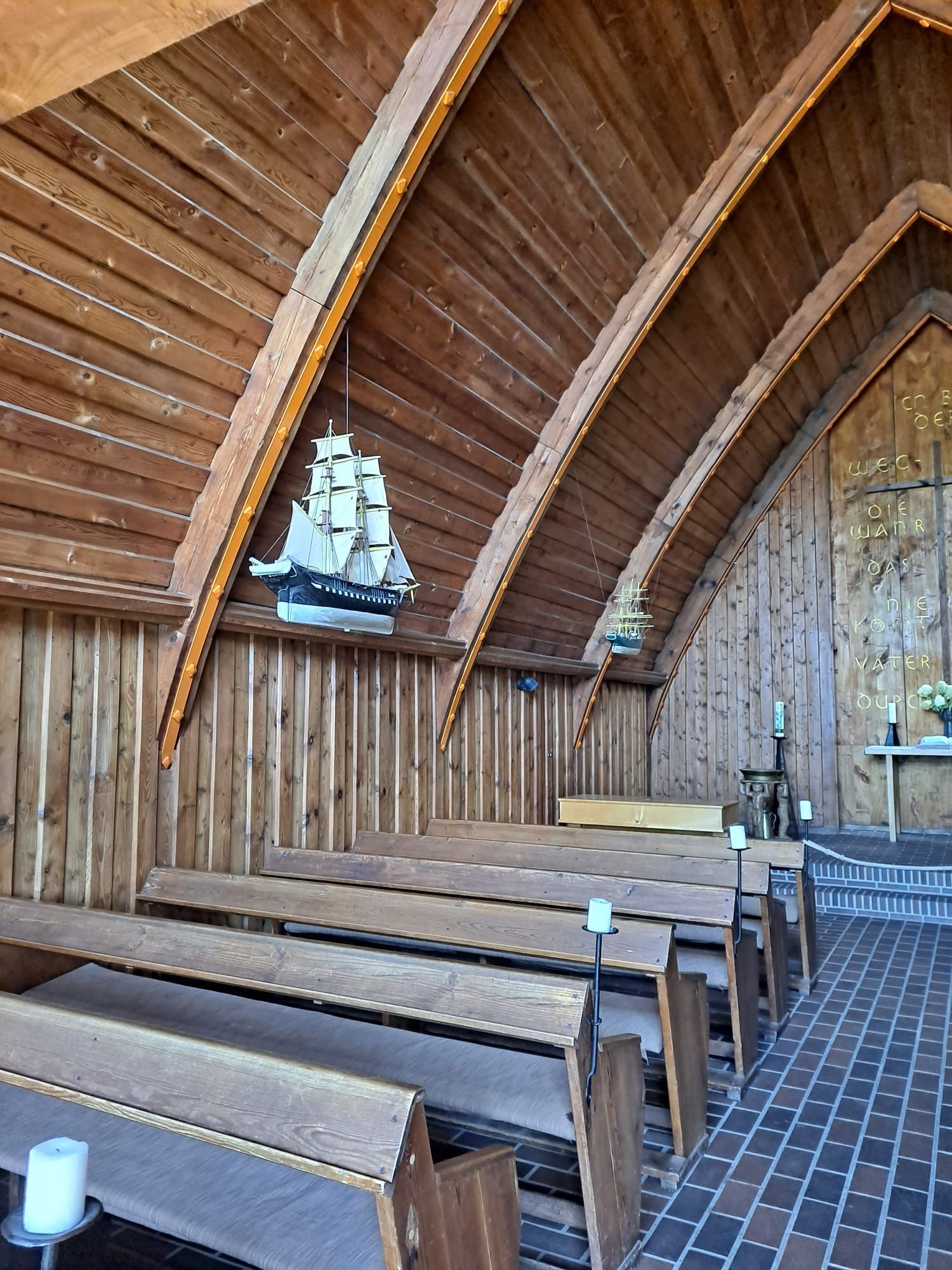 Kurz vor Dierhagen bekam Philipp eine Whatsapp-Nachricht von Viko Getzschmann, ein Bäcker aus Falkenberg, dass er hier einen Freund hat, der auch Bäckermeister ist und dass wir dort gern einen Besuch abstatten können, wenn wir gute Backwaren schätzen. Die Filiale der Bäckerei Boldt war nur 300 Meter entfernt, weshalb wir nicht lange darüber nachdenken mussten. Wir haben uns sehr für die Empfehlung bedankt, denn wir hätten etwas verpasst. In Ahrenshoop besichtigten wir die Schifferkirche. Philipp hatte hier eigentlich vor Orgel zu spielen. Das hat leider nicht geklappt. Philipp hatte zwar die Anfrage gestellt, aber der Organist hatte sich zu spät bei ihm gemeldet und der Schlüssel war leider zu gut versteckt ;-)