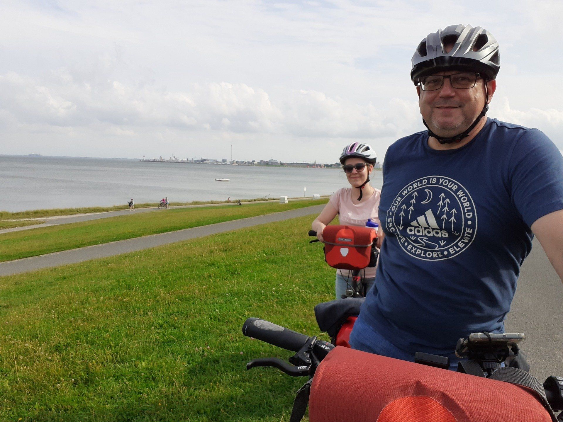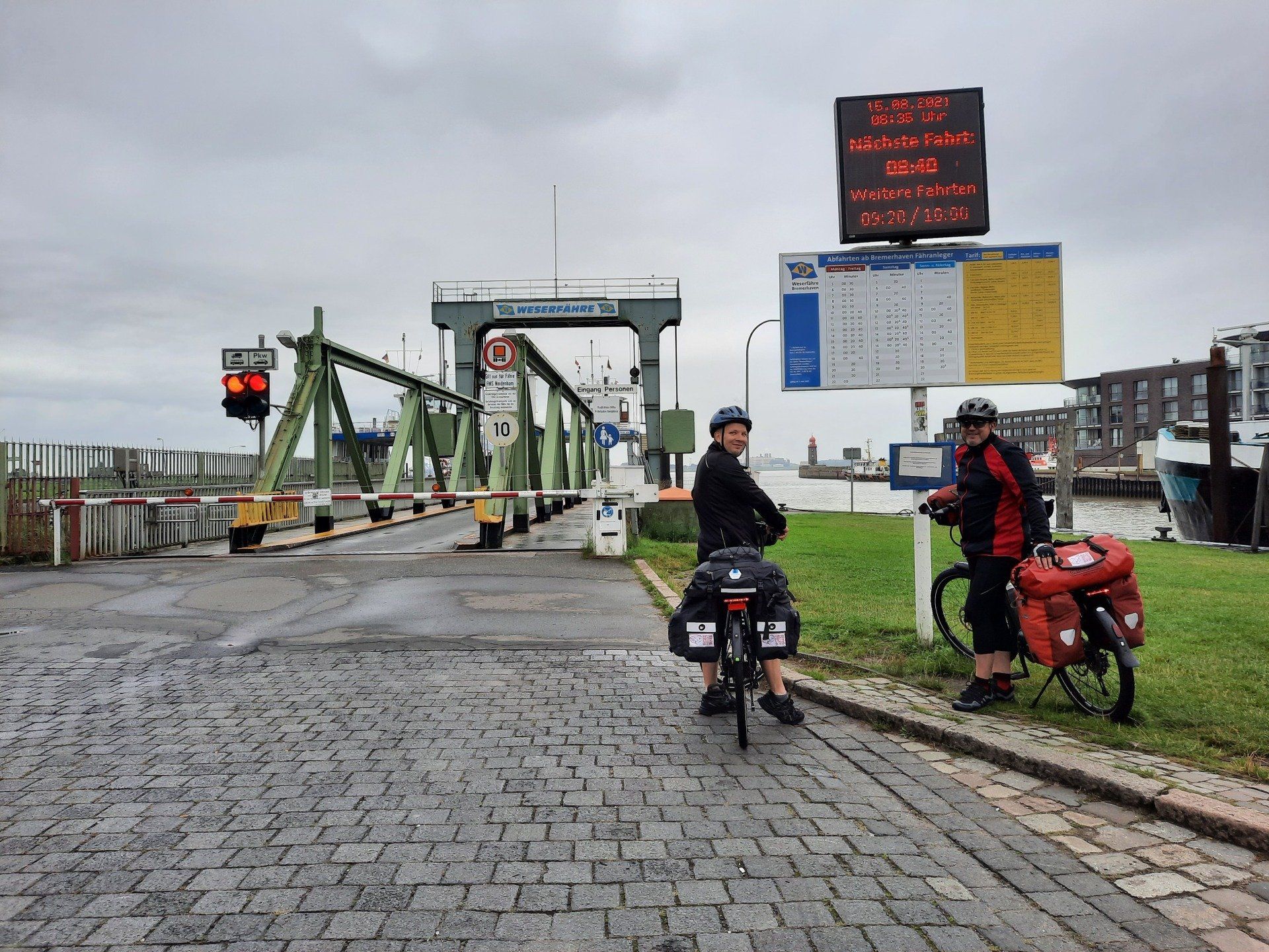 Nossa manhã começou com chuva, então tiramos nossas roupas impermeáveis apropriadas da bagagem na balsa Weser em Bremerhaven. Quando chegamos ao outro lado do Weser, o tempo havia melhorado e pudemos arrumar nossas coisas novamente.
