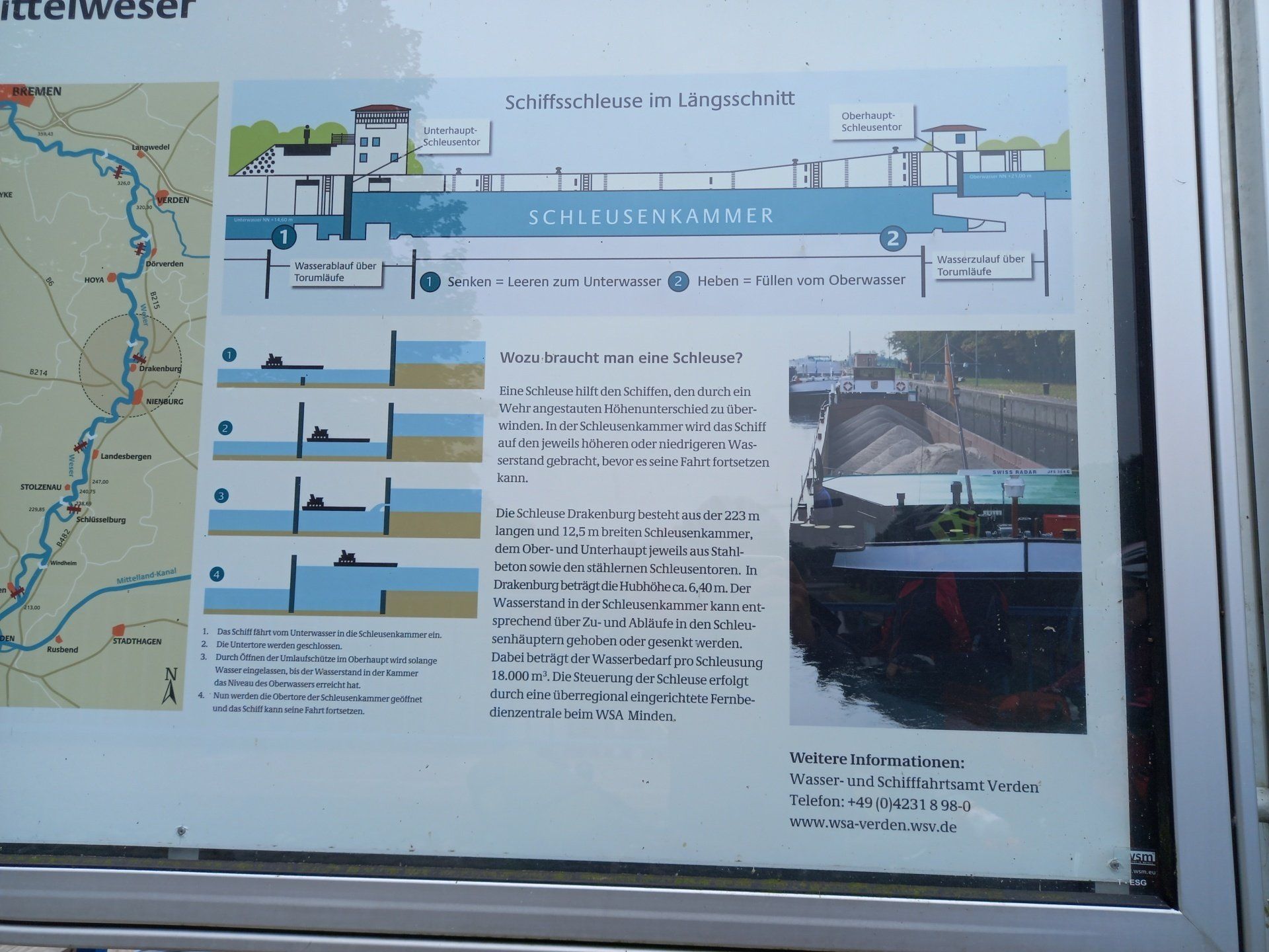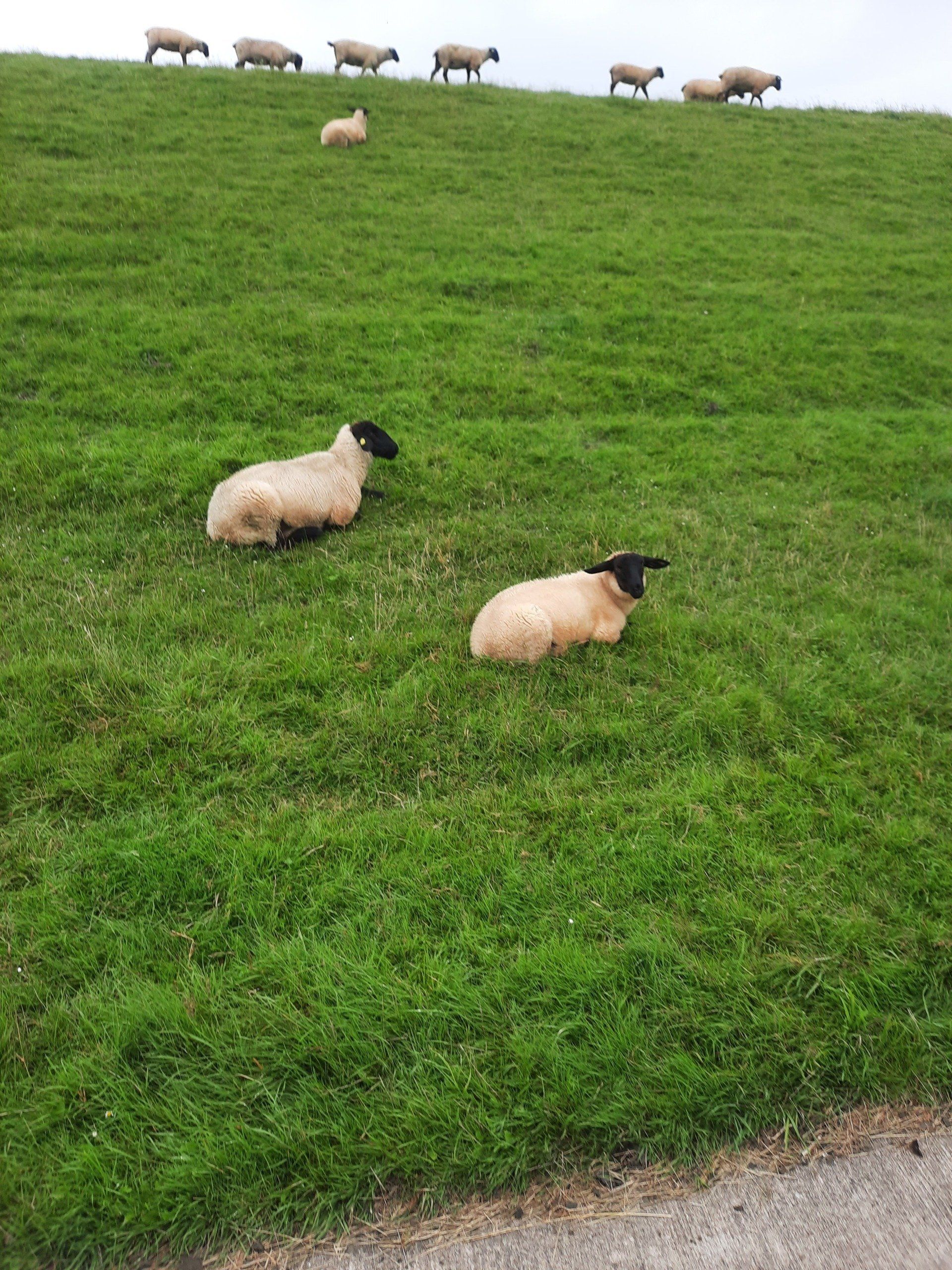 Chegamos a um pequeno porto bem a tempo de atravessar a ponte da eclusa. É por lá que os navios entram e saem do Weser. Mais uma vez, ficamos muito impressionados com as possibilidades técnicas criadas para harmonizar o tráfego de navios e pedestres/bicicletas. Primeiro, o corrimão da ponte abaixa e, em seguida, a ponte se retrai. Tiramos uma foto para vocês quando a ponte está na metade. E, claro, as ovelhas também não poderiam ficar de fora :-)