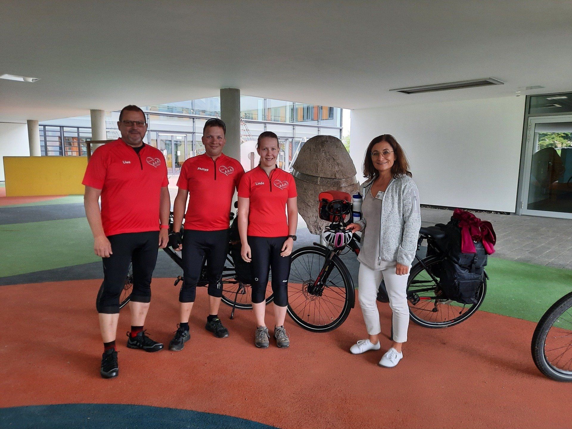 Por volta das 14h30, chegamos à cidade de Minden e tiramos uma linda foto em frente à eclusa. Compartilharemos com vocês, é claro. Após outra breve pausa, seguimos em direção a Porta Westfalica. Da ciclovia, podíamos avistar o famoso monumento da cidade. Felizmente, a ciclovia continuou a melhorar, então conseguimos percorrer alguns quilômetros até o final. Por volta das 15h, nos encontramos com a Sra. Bahl e a Sra. Wolf, da Iniciativa para Pais de Crianças com Câncer, em frente ao hospital de Minden. Fomos calorosamente recebidos com um pequeno bufê. Conversamos sobre o trabalho da associação e a importância de manter o contato entre pais e filhos durante a internação. A ala pediátrica de câncer é a única do hospital com varanda, para que as crianças possam respirar ar fresco. Um esforço especial foi feito para acomodar isso durante a construção do hospital. Só podemos confirmar que os funcionários da associação são apaixonados pelo seu trabalho. Dessa forma, podemos ter certeza de que cada doação para este projeto está em cem por cento boas mãos. Poderíamos ter conversado por horas, mas o próximo compromisso estava chegando.